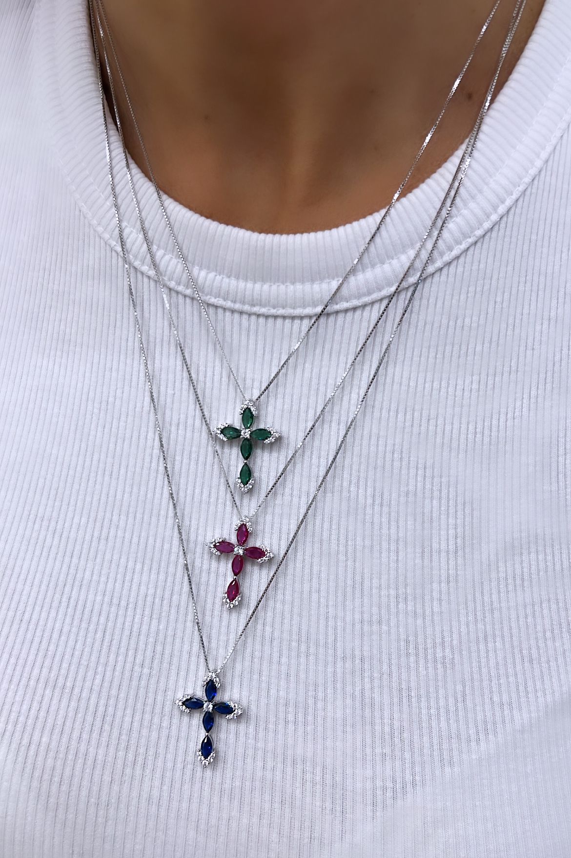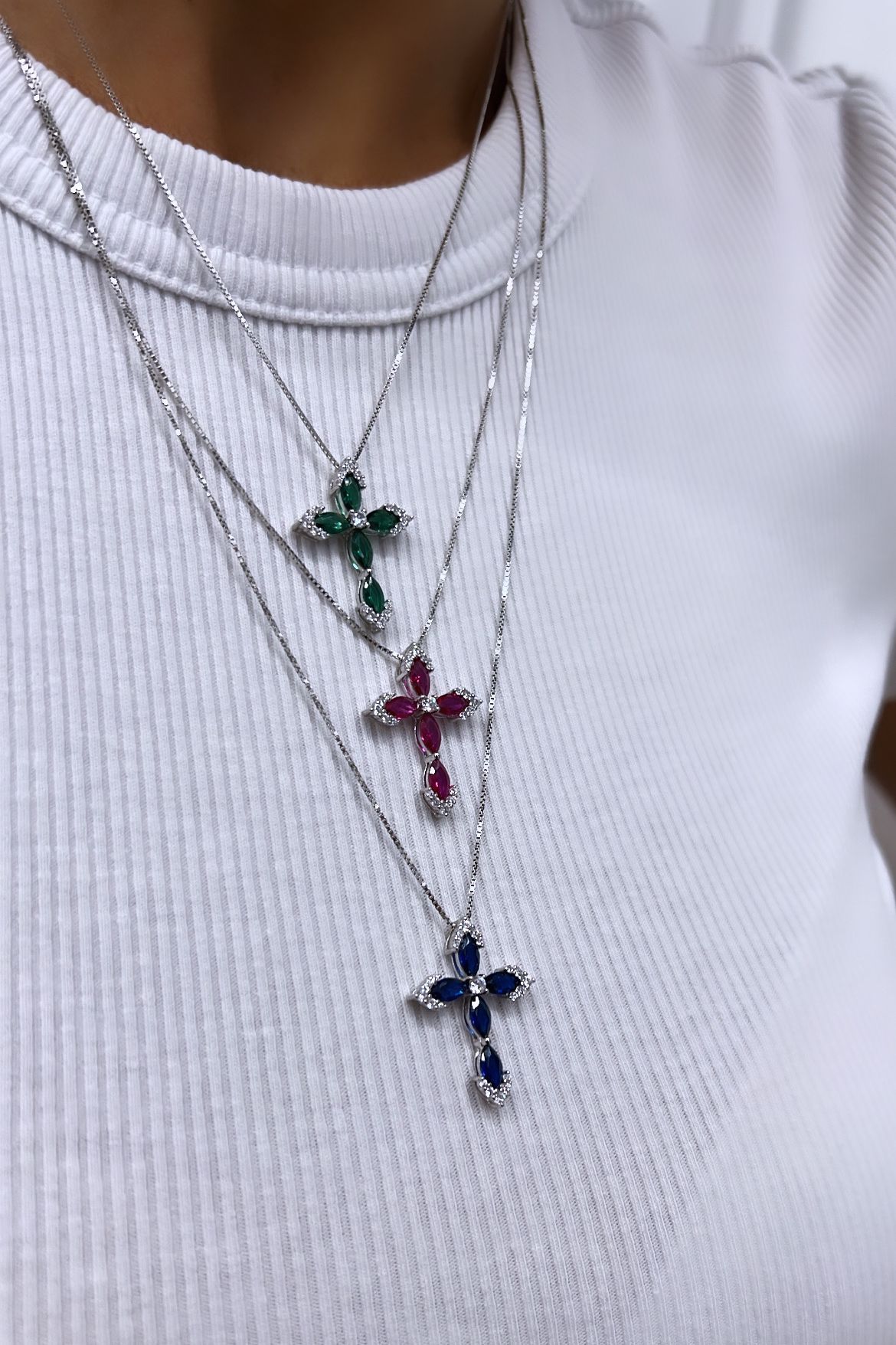 La croce è arricchita da Rubini, Zaffiri e Smeraldi, offrendo un gioco di colori che cattura l'attenzione e aggiunge un tocco di lusso e raffinatezza al tuo look.