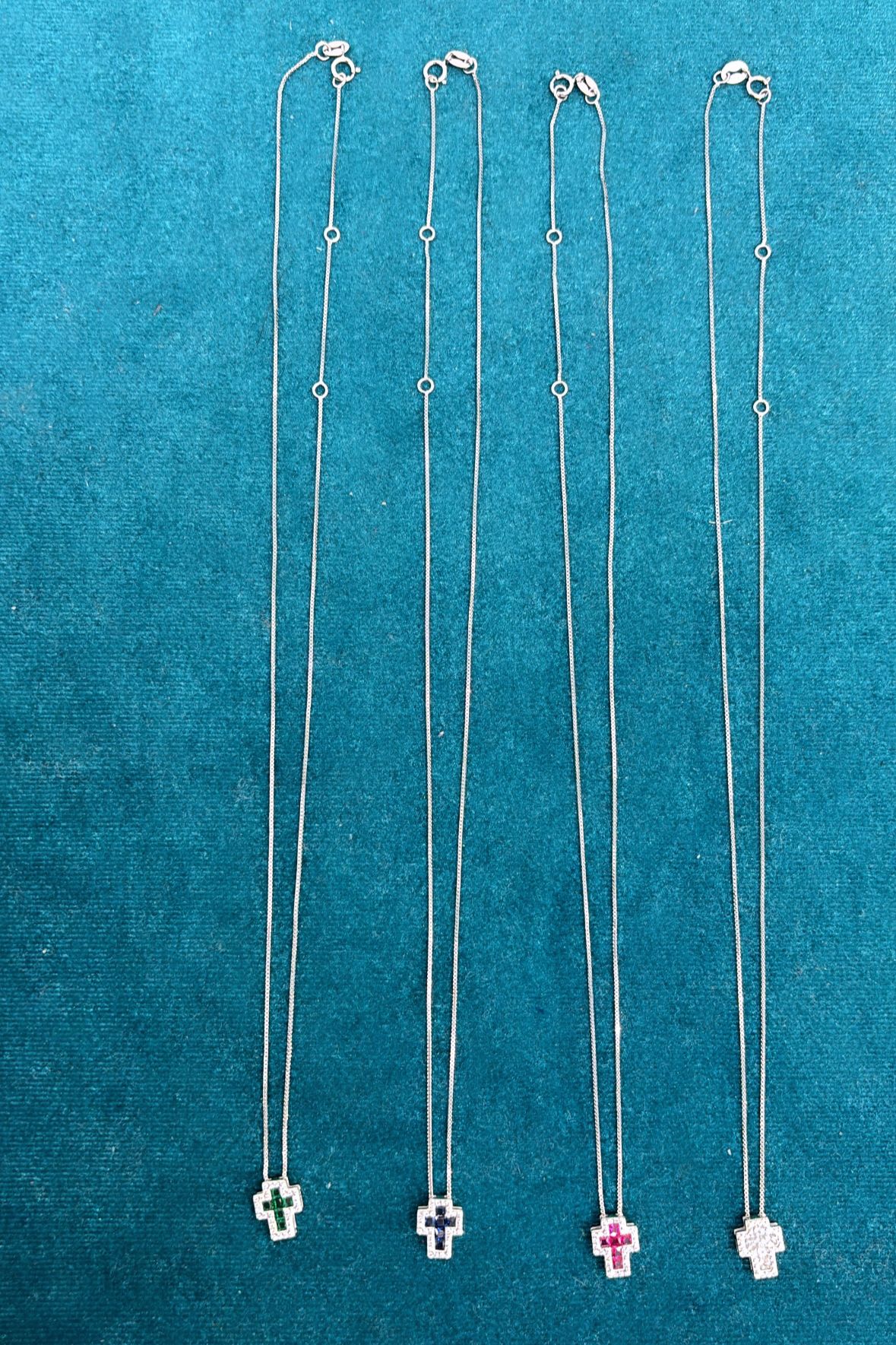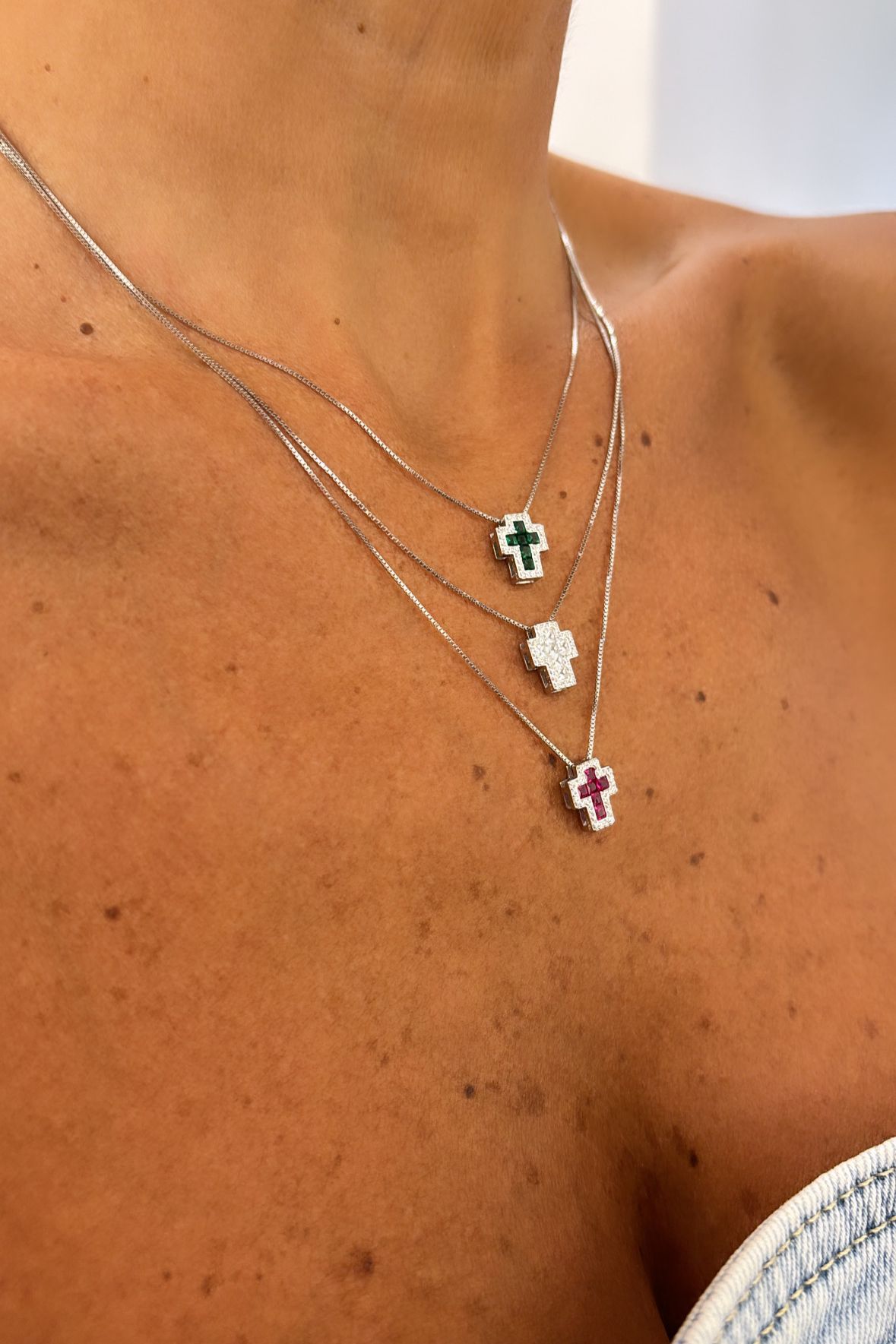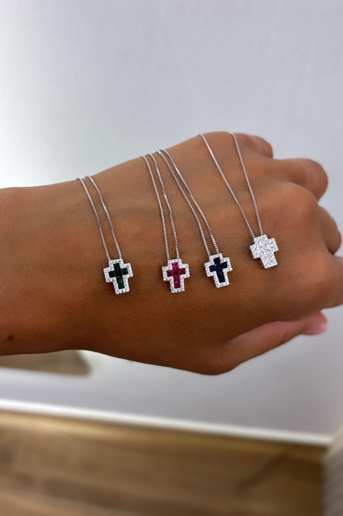 La Collana Mini Cross è un gioiello delicato e raffinato, realizzato in argento 925 e arricchito da zirconi brillanti. Il pendente a forma di croce è disponibile in quattro colorazioni di pietra: bianco, smeraldo, zaffiro e rubino, per un tocco di colore che si adatta ad ogni stile.