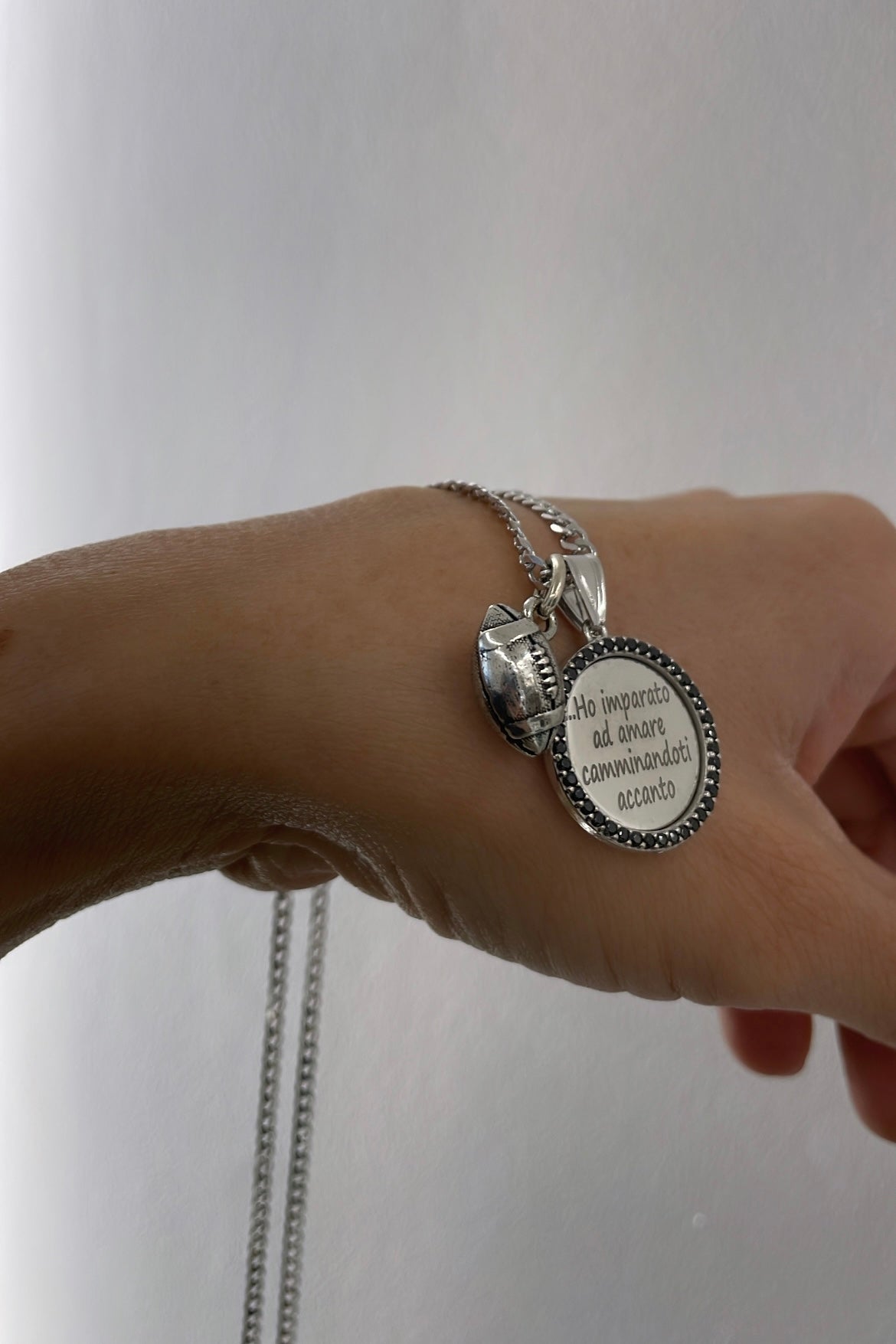 Ciondolo a forma di palla da rugby realizzato in Argento 925, un gioiello originale pensato per i papà che amano questo sport e vogliono portare sempre con sé la propria passione.