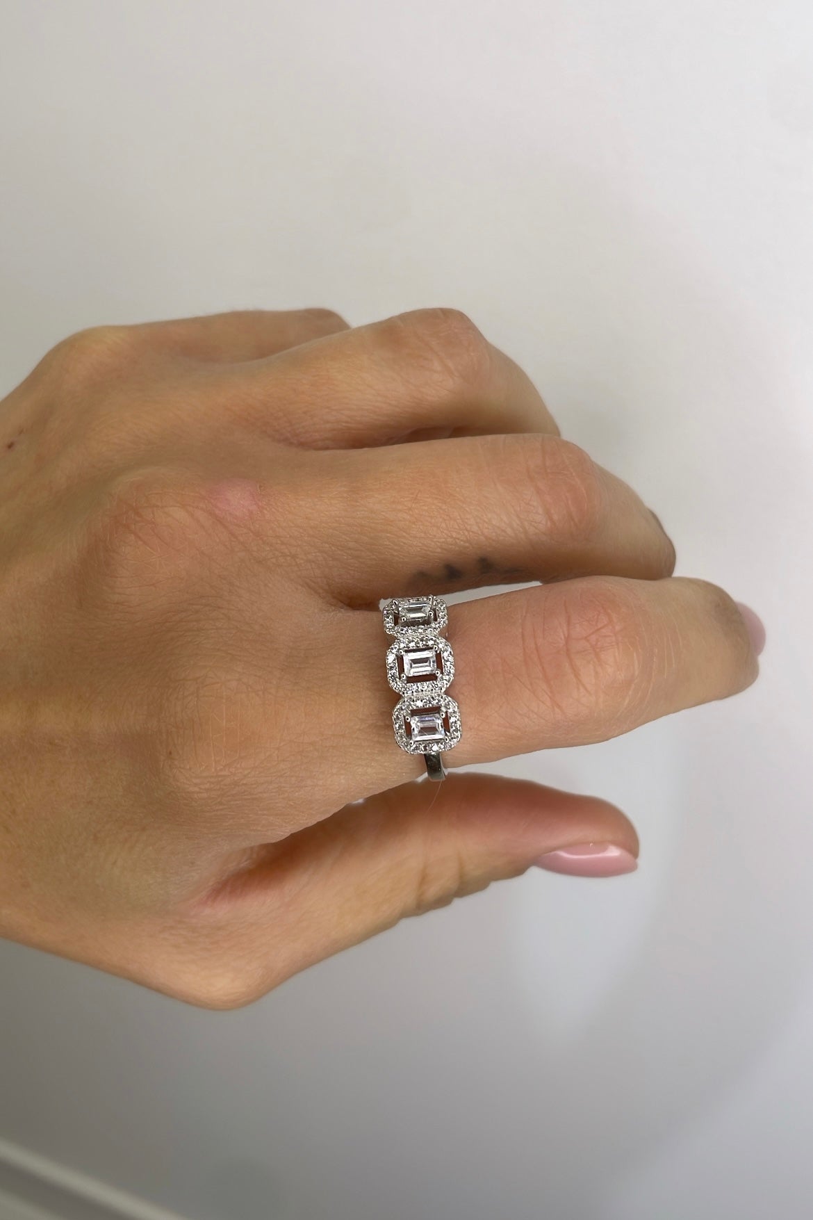 L’Anello Mireya è un gioiello raffinato e luminoso, realizzato in Argento 925 e impreziosito da splendidi zirconi scintillanti. Il design è valorizzato da tre pietre centrali di grande dimensione, che catturano la luce con eleganza e donano carattere e personalità al gioiello.