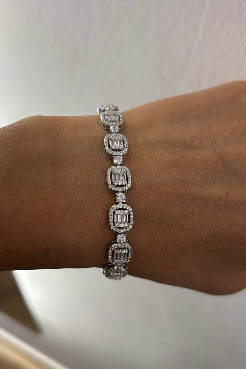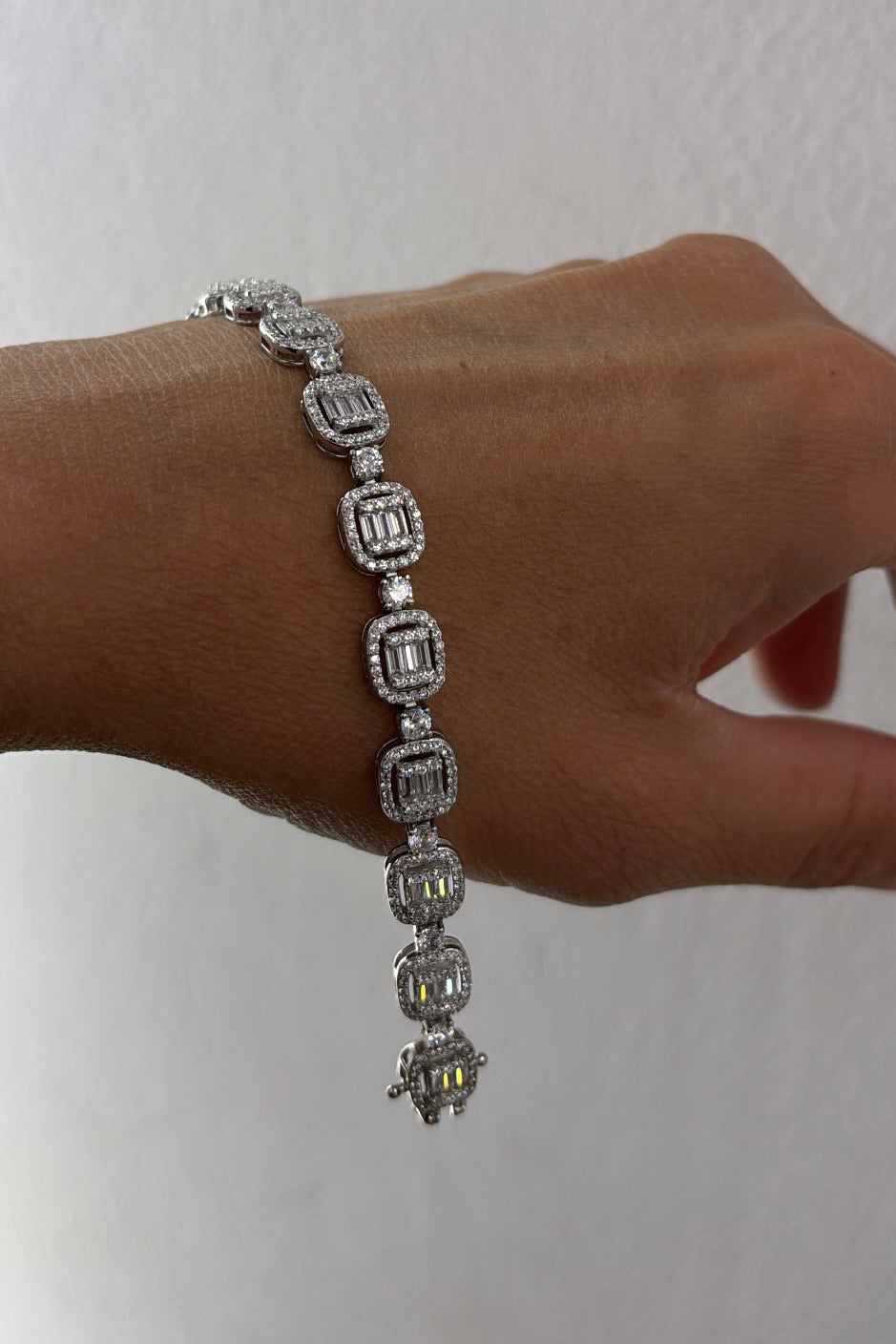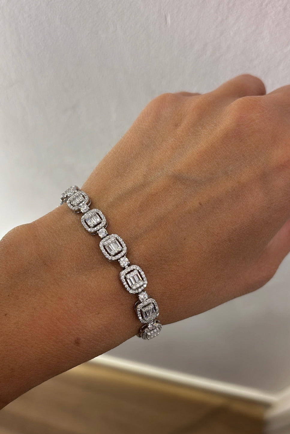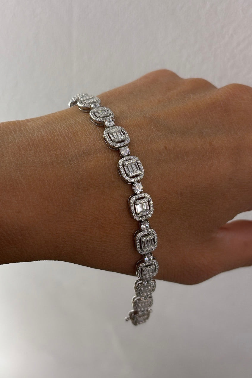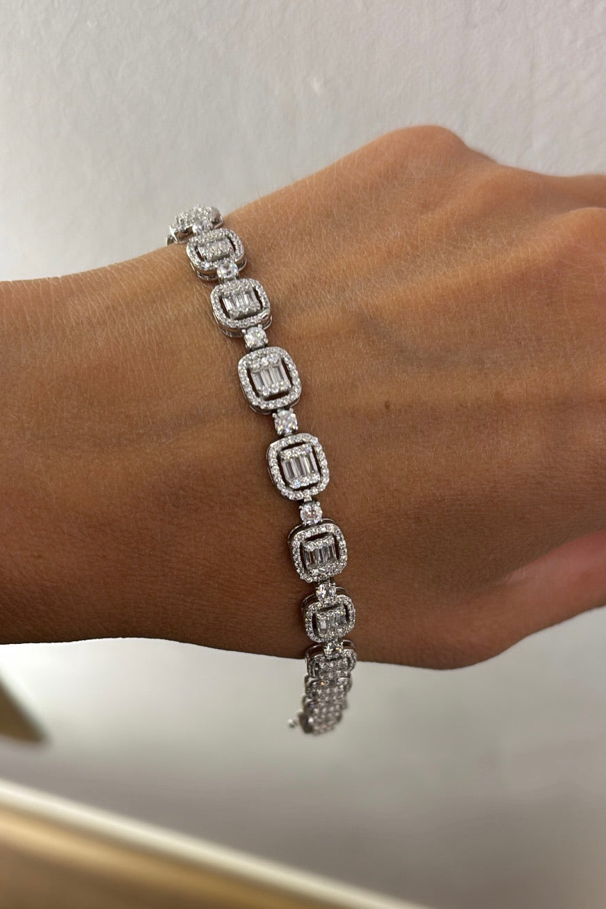 Il Bracciale Reina è l’emblema della femminilità decisa e sofisticata. Realizzato in argento 925, unisce la lucentezza dei zirconi tondi alla geometria elegante dei zirconi taglio baguette, disposti in una sequenza quadrata alternata che dona luce e carattere a ogni movimento.
