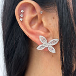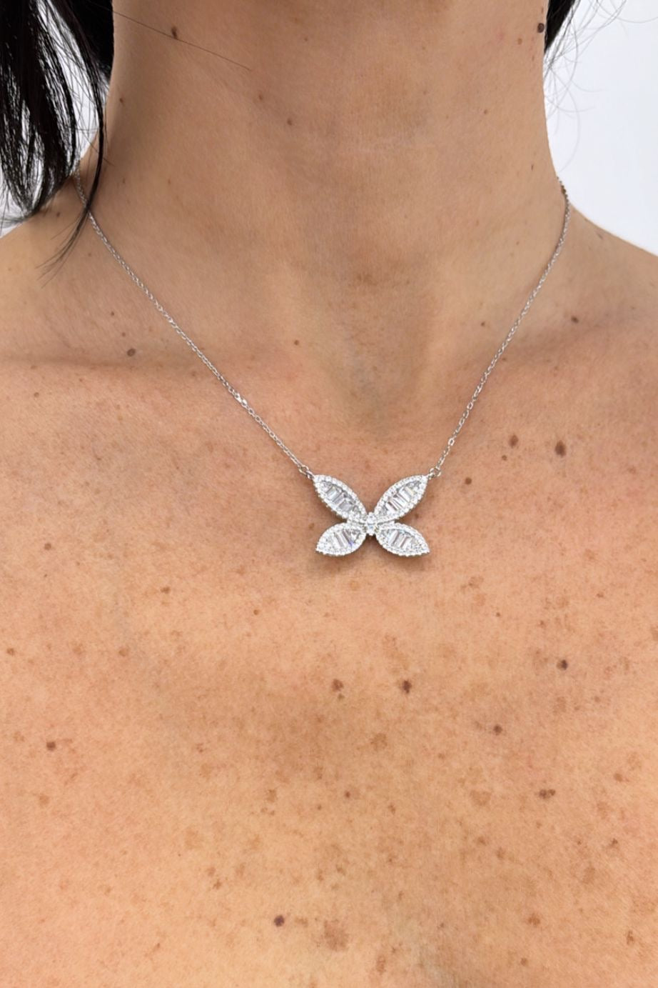 Un'interpretazione elegante della libertà e della grazia, è composta da una collana e orecchini realizzati in argento 925 e arricchiti da zirconi baguette, che conferiscono un'effetto scintillante e sofisticato. Il design a farfalla, simbolo di trasformazione e bellezza, è enfatizzato dai dettagli luminosi, rendendo ogni pezzo della collezione un'ode alla femminilità e all'eleganza.
